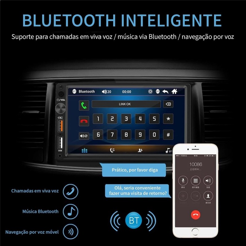 - Conectividade: Bluetooth 5.1, Mirror Link, 2x portas USB, AUX, entrada TF.